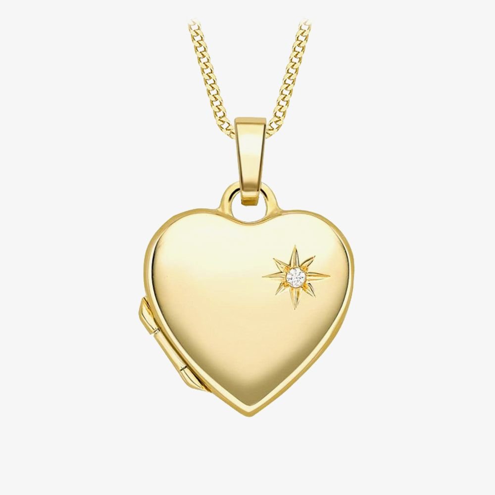 This heart-shaped diamond locket in 9ct yellow gold features a single diamond. Accompanied by a delicate diamond-cut curb chain, it makes a perfect keepsake gift.