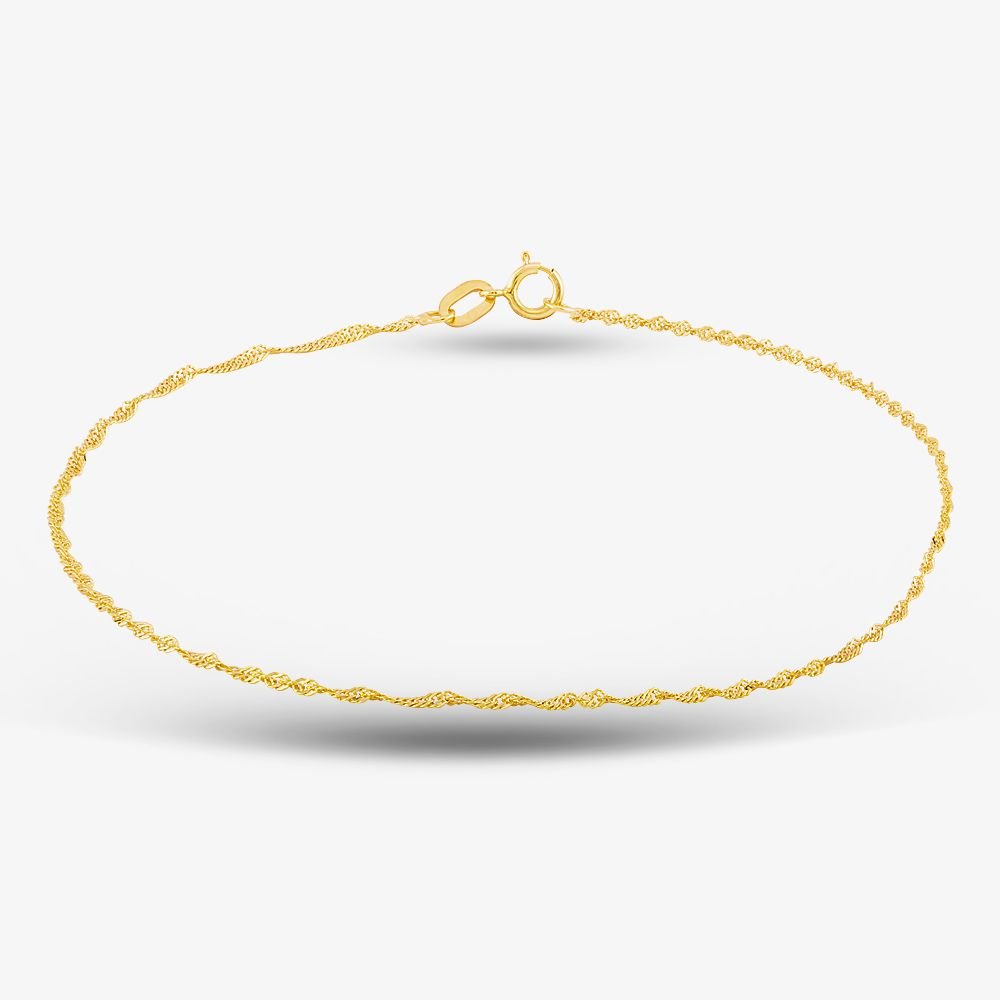 Elegant 9ct yellow gold anklet with a twist curb chain design. Features a 0.8mm width and a spring ring fastening for easy wear. Perfect for adding a touch of luxury to any outfit.