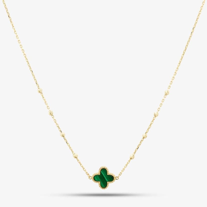 This 9ct yellow gold necklace features a malachite clover pendant with a rich green hue. The pendant is suspended from a delicate trace and ball chain, adding a touch of texture and detail. Perfect for adding a touch of luxury to any outfit.