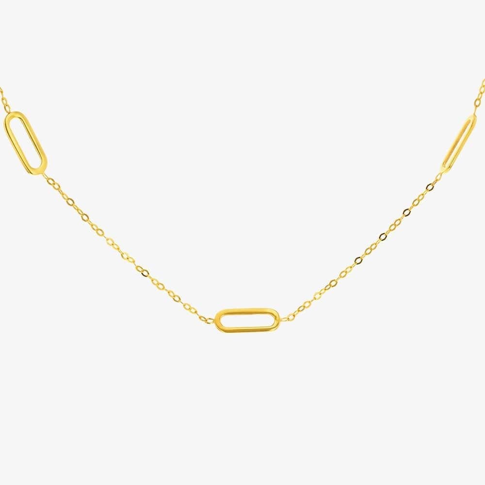 This gold paper link necklace effortlessly combines classic charm with modern style. Crafted with precision, it features three sleek paper clip links, adding a touch of timeless elegance. Perfect for minimalist looks or layering with other necklaces.