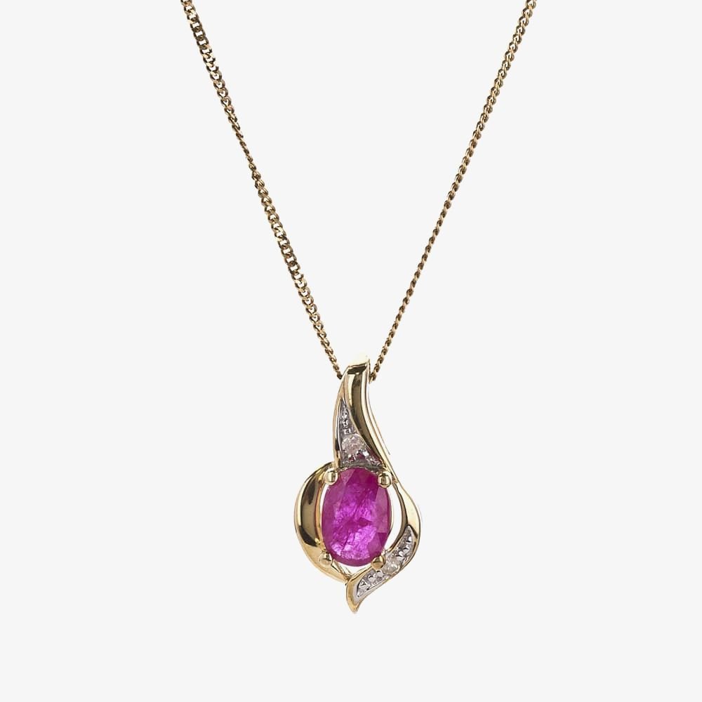 A stunning gold pendant necklace featuring a 6x4mm oval-cut ruby surrounded by a swirling frame of 9ct yellow gold and two diamonds. Ideal for adding a touch of elegance to any outfit.
