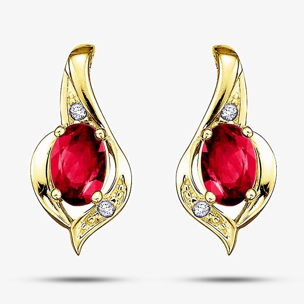 Luxurious 9ct yellow gold stud earrings featuring oval-cut rubies and round brilliant diamonds. Perfect for adding a touch of elegance to any outfit.