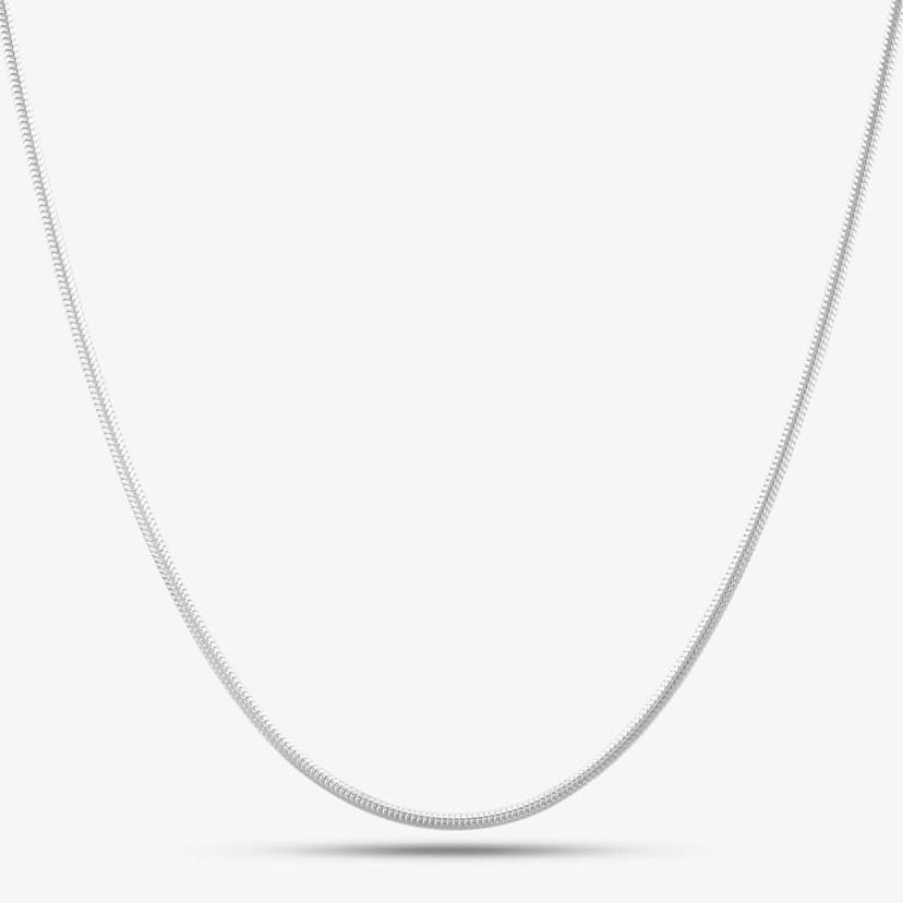 View Debenhams's returns policyThis 18-inch silver snake chain necklace features tightly linked, smooth round segments that create a fluid, flexible line with a subtle reflective sheen. Its polished surface enhances the chain's sleek, modern appearance, while the 1.6mm width provides a comfortable weight that drapes effortlessly.