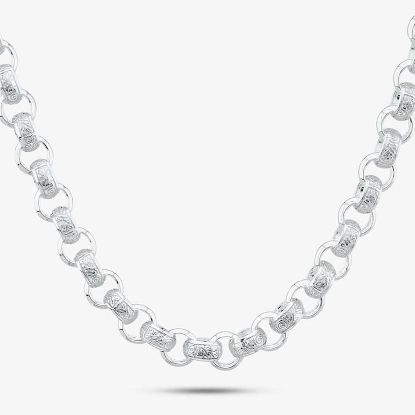 Elevate your style with this patterned belcher chain from T.H.Baker, crafted from the finest sterling silver. Every other link is adorned with an engraved pattern, creating a unique piece of jewellery. Perfect for layering or wearing solo, the 20 inch length ensures a comfortable fit.
