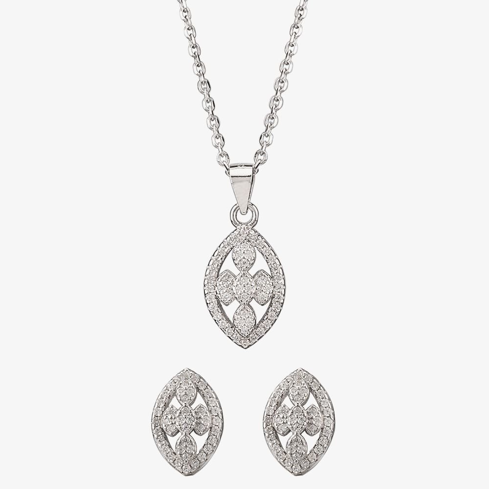 The T.H.Baker Silver Pave Open Marquise Pendant & Earring Set is made from sterling silver, cubic zirconia.