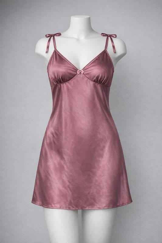 This pink satin chemise features a V-neckline, tie straps, and lace trim. The regular fit and glossy fabric make it perfect for a romantic evening or casual lounging.