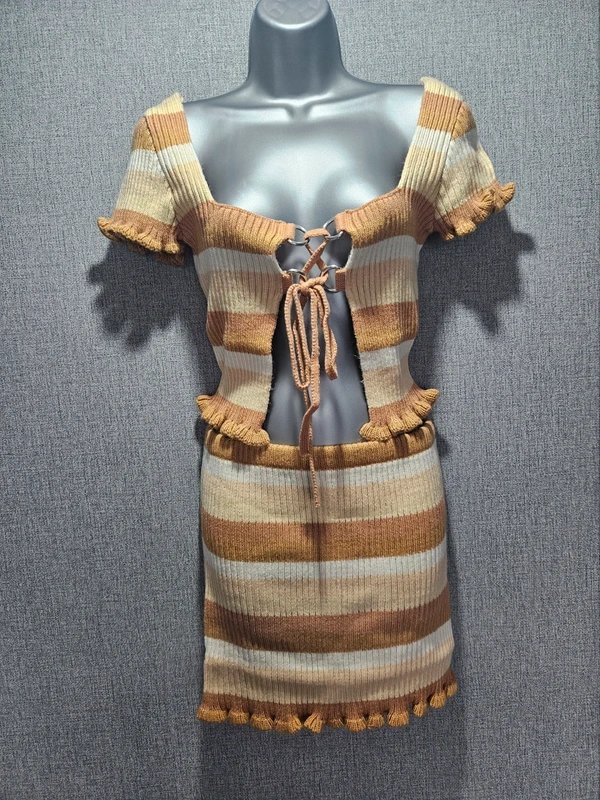 The Ragged Priest crochet knit co-ord set features a striped cut-out top and skirt. Designed in beige and brown stripes, this two-piece set includes a stretch knit fabric with ruffle trim edges. The top has a cut-out lace-up front detail, making it a super flattering and standout piece. Perfect for festivals and casual outings.