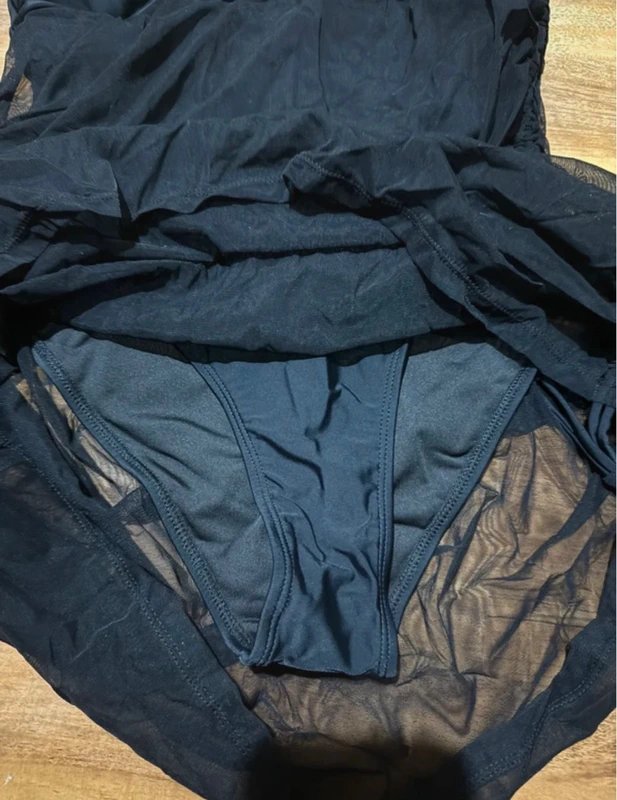A brand new black swim dress swimsuit with a classic V neckline, adjustable shoulder straps, and sottly ruched sides to smooth and shape. The attached inner swimsuit provides full coverage while the sheer outer layer creates a floaty, elegant swim dress look that's perfect for holidays and poolside wear.