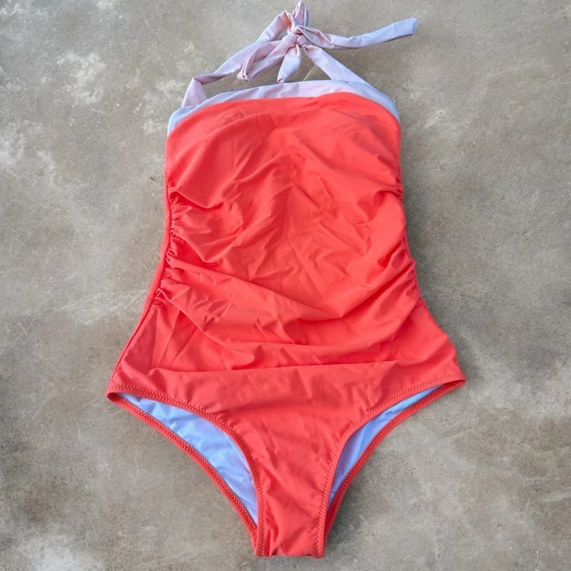 Designed in bright orange, this one-piece swimsuit features a halter neck with a tie for adjustable fit and support. The ruched detail provides tummy control and shape, while the fully lined interior ensures comfort and coverage. Perfect for beach days, poolside or holidays.