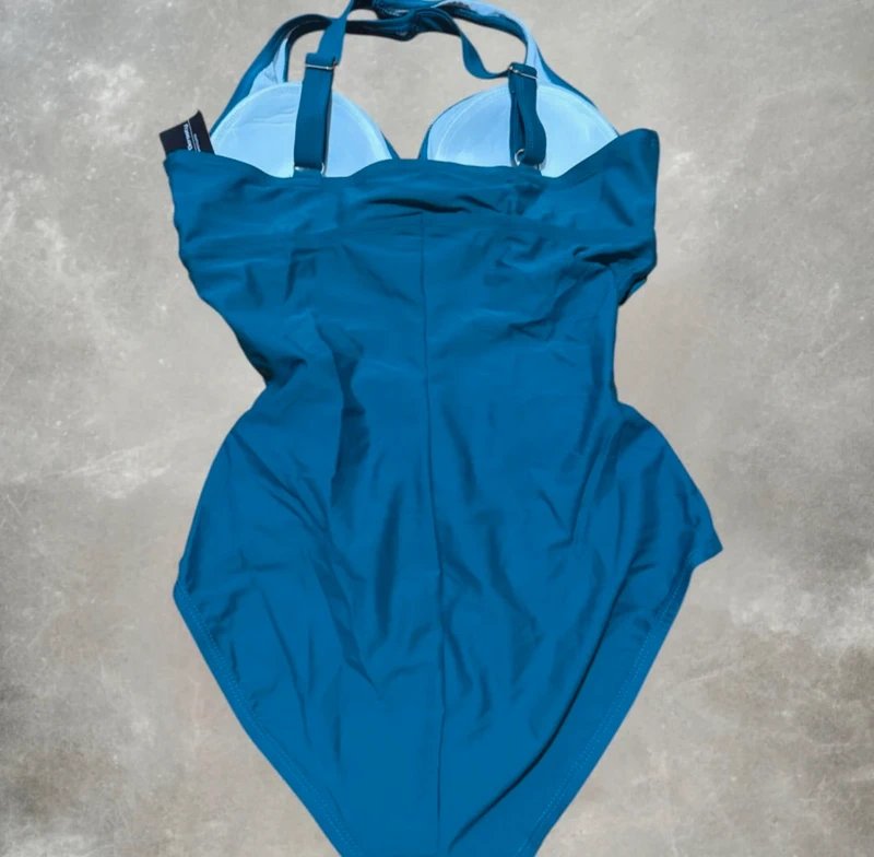 This teal one-piece swimsuit is designed to flatter and provide support. Featuring a ruched front, adjustable straps, and built-in tummy control, it is perfect for holidays and poolside lounging.