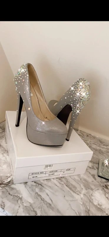 Dazzling silver platform high heels adorned with sparkling crystals. Perfect for parties, nights out, or any occasion where you want to make a statement. These heels combine glamour with a touch of sparkle, making them a standout choice for any event.