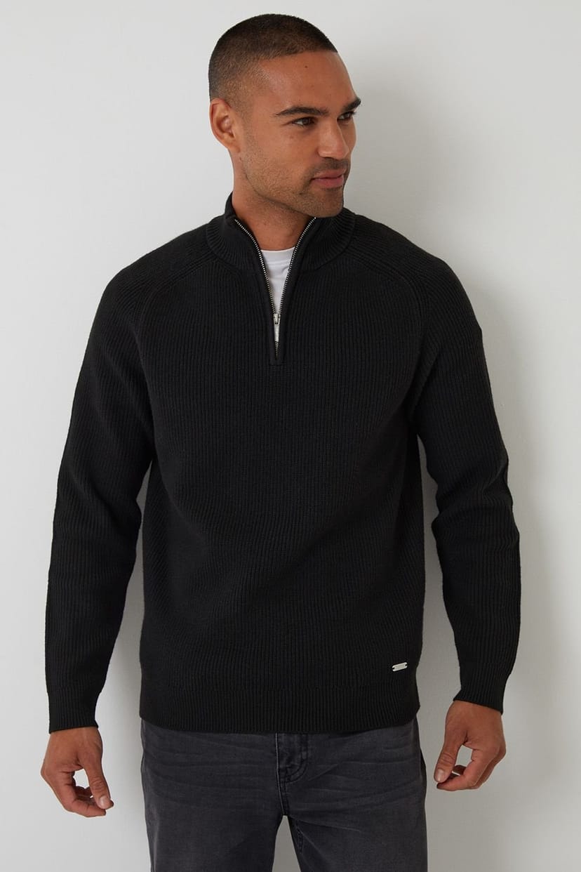 Layer up in style with this quarter zip textured knitted jumper from Threadbare. Made from a cotton blend fabric, it features ribbed panels under the arms for added texture and movement. Finished with a ribbed funnel neck, concealed quarter zip, cuffs, and hem for a comfortable fit.