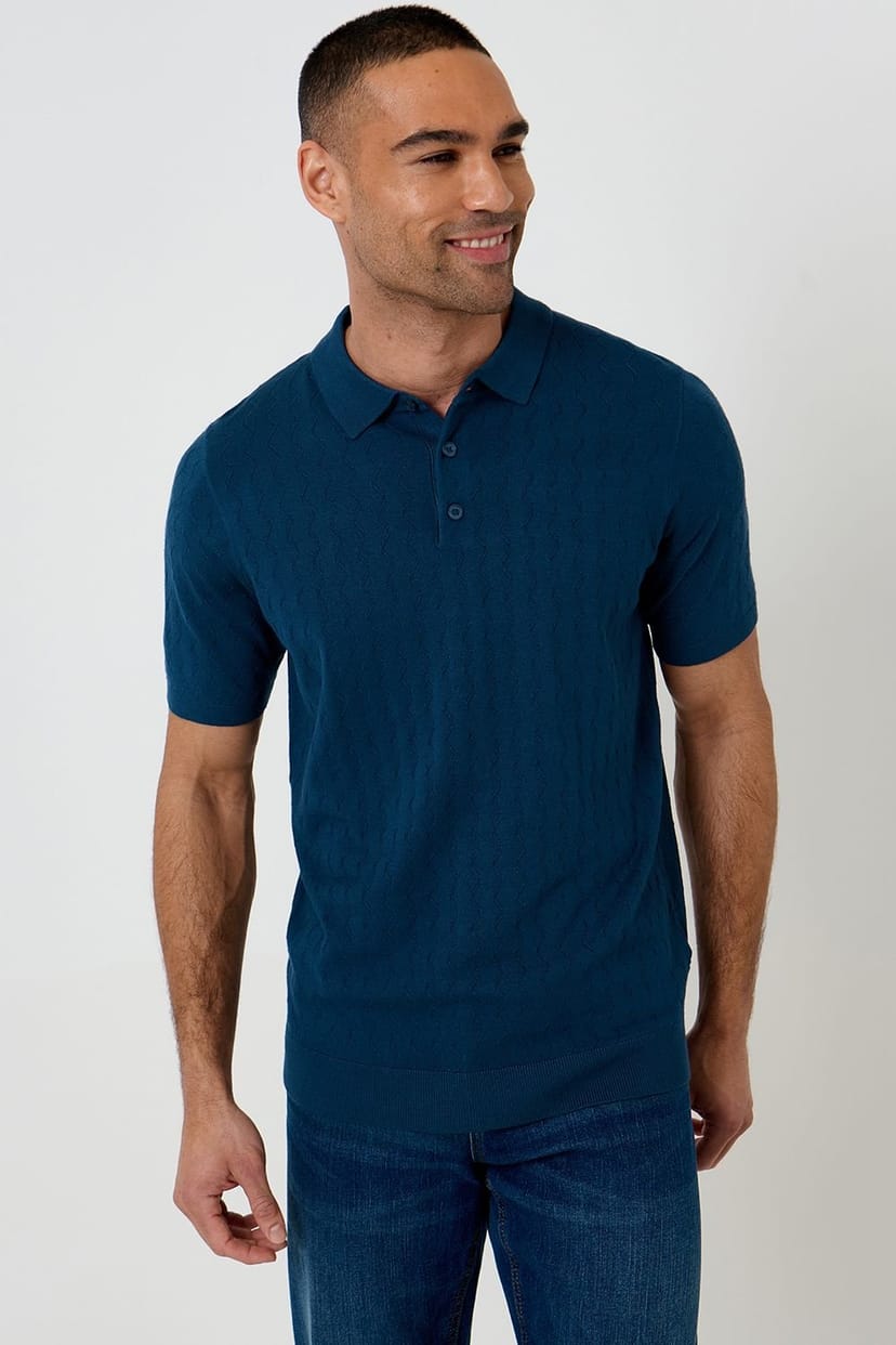 Elegant blue knitted polo with a zig zag stitch pattern and classic polo collar. Features pearl effect buttons and ribbed cuffs and hem for a refined look. Perfect for smart-casual occasions.