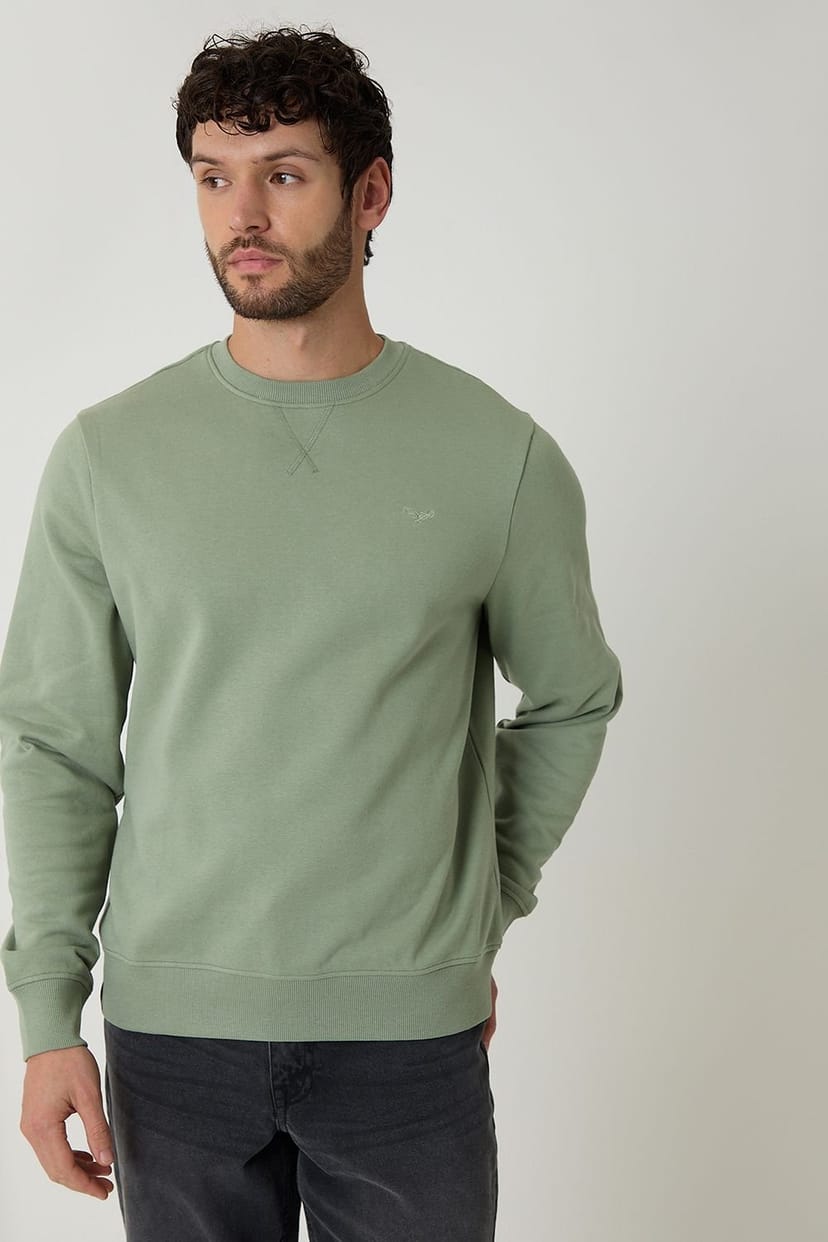 This Threadbare crew neck sweatshirt in green is made from a cotton blend fabric for a comfortable feel. Features elasticated cuffs and hem for a snug fit. Perfect for casual wear.