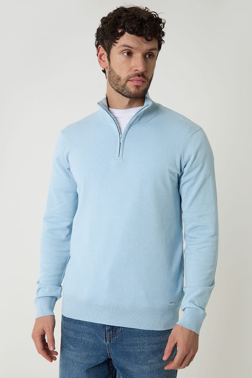 Refresh your knitwear collection with this light blue funnel neck quarter zip jumper from Threadbare. Crafted in a soft jersey knit, this jumper features a ribbed funnel neck that fastens with a quarter zip, ideal for layering. With ribbed cuffs and hem, this lightweight jumper will keep you snug.