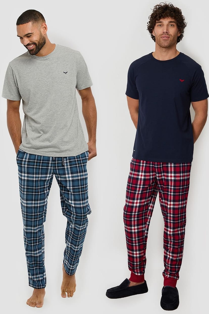 Relax in style with these Threadbare men's 2-pack pyjama sets. Each set includes a short sleeve t-shirt with chest embroidery and a ribbed crew neck. The brushed check bottoms feature an elasticated waistband, drawcords, and side entry pockets. Perfect for lounging at home.
