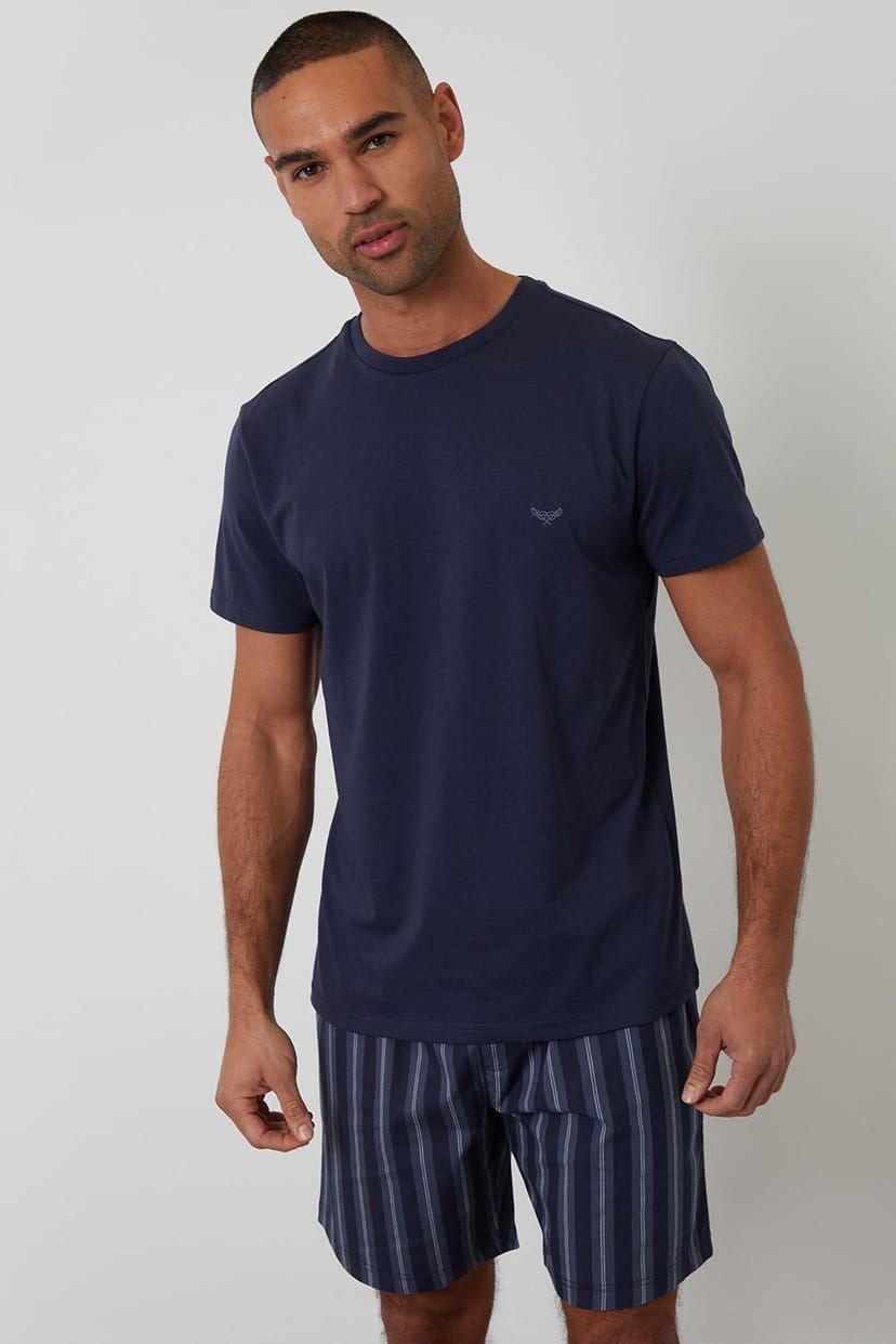 Experience ultimate comfort in this navy blue short-sleeve T-shirt and striped shorts set from Threadbare. The ribbed crew neck T-shirt features a subtle logo embroidery, while the cotton poplin shorts offer an adjustable drawcord waist and two side pockets. Ideal for a restful night's sleep.
