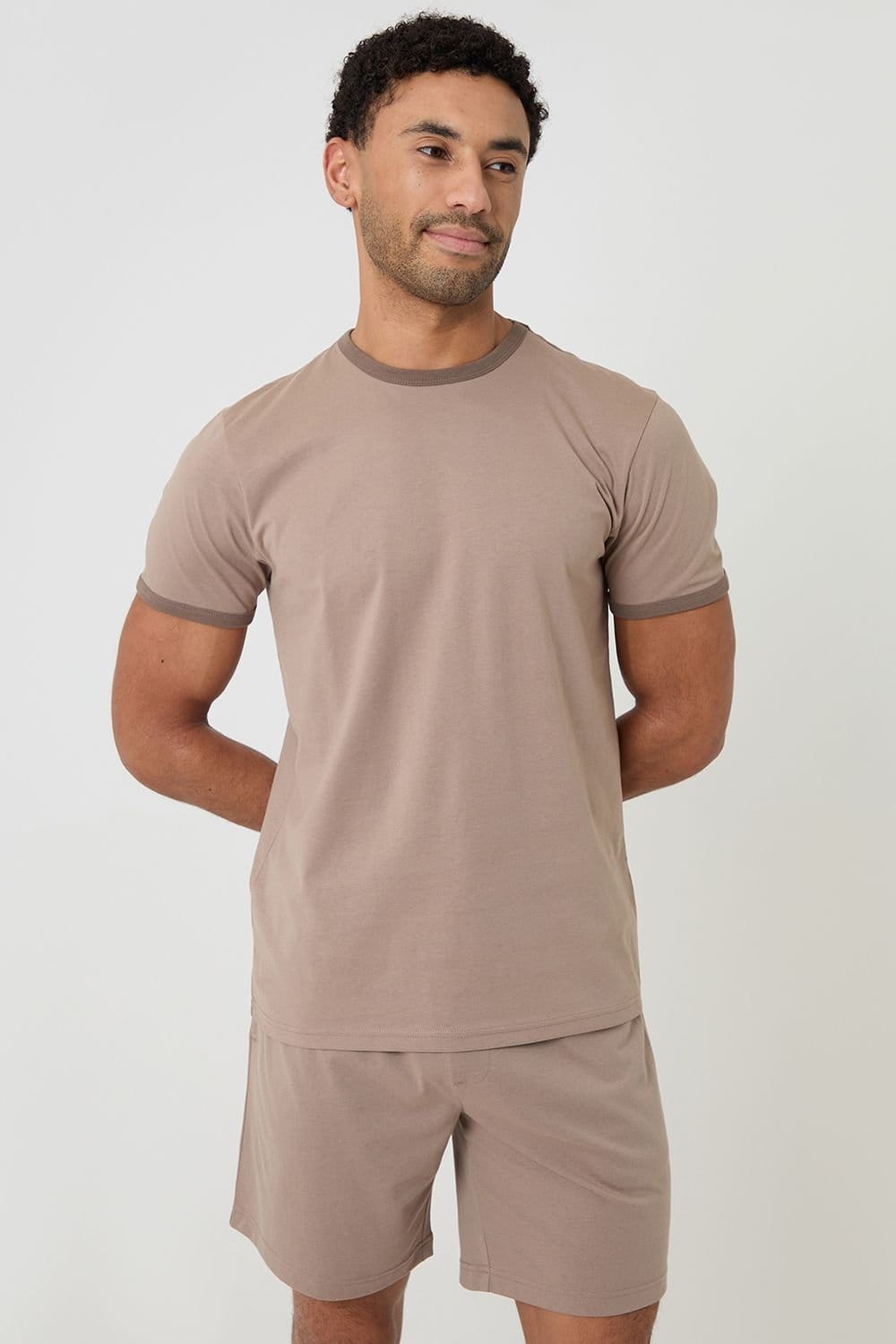 Relax in this comfortable Stone contrast binding short lounge set from Threadbare. The regular-fit T-shirt features a ribbed crew neck and contrast binding for a clean, sporty look. Paired with matching shorts featuring adjustable drawcords and two handy side pockets, this set offers easy comfort.
