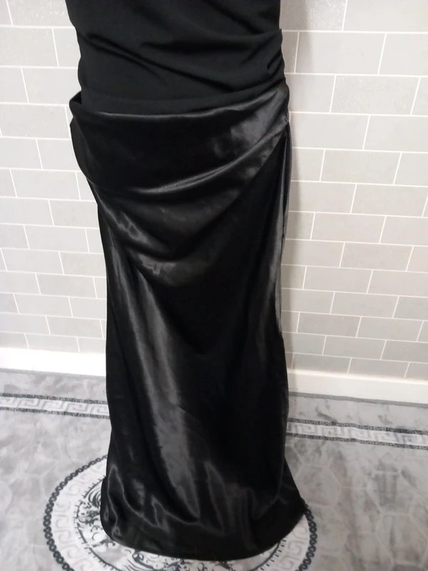 The Tiktok Viral Black Satin Evening Gown is available in sizes L.