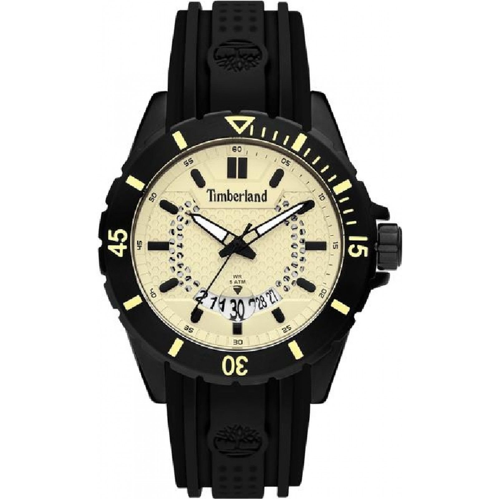 Stylish and durable, this Timberland watch features a black resin strap and a cream dial with yellow accents. Ideal for everyday wear and outdoor activities.