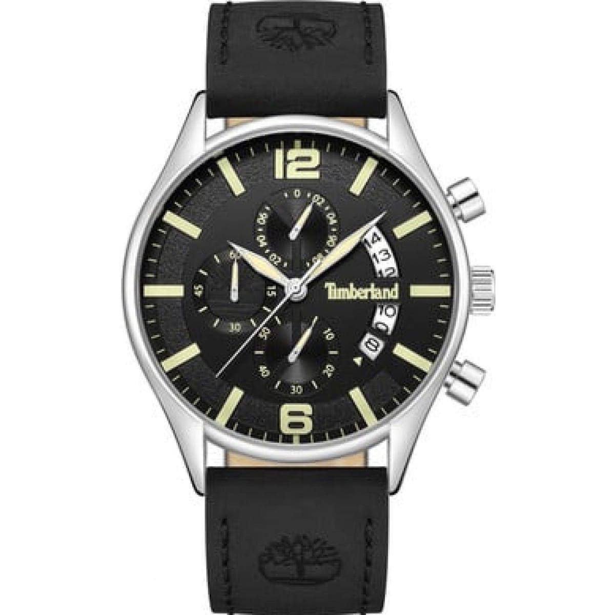 Stylish Timberland watch with a black dial and black leather strap. Features a quartz movement and date function, perfect for everyday wear.