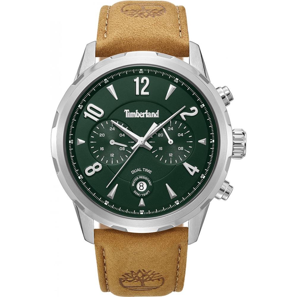 Stylish Timberland Newkirk watch in brown with a leather strap and dual time zone feature. Ideal for versatile everyday wear.