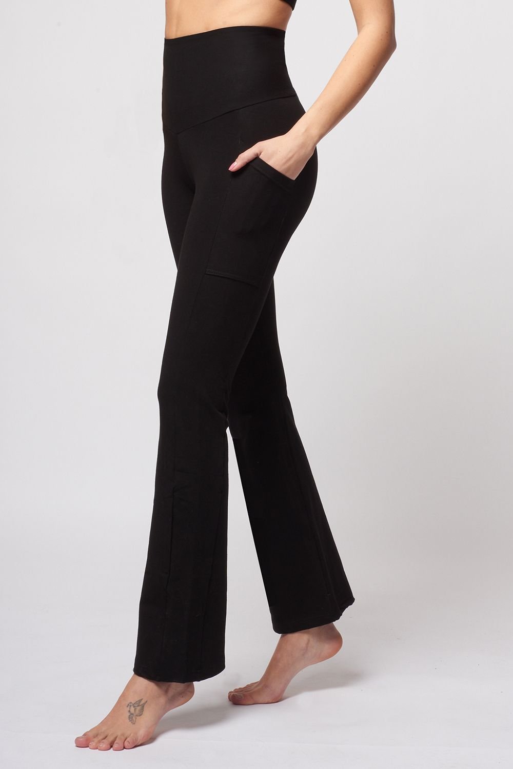 Stylish black compression bootcut pants designed for real women by TLC Sport. Made from bespoke fabrics that retain shape and colour, perfect for sustainability and repeated wear.