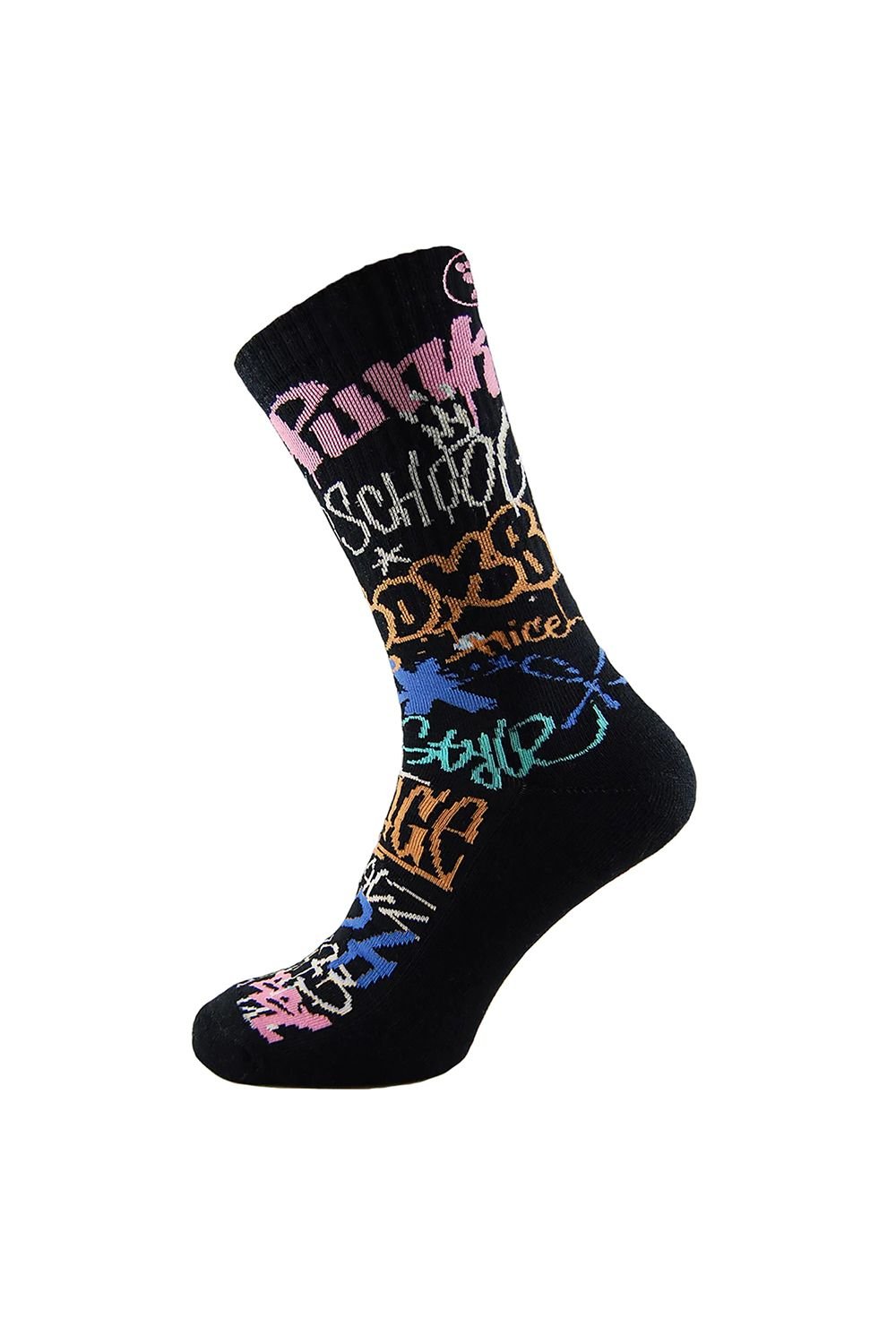 Stylish black crew socks with vibrant street graffiti print. Perfect for adding a touch of urban flair to any outfit.