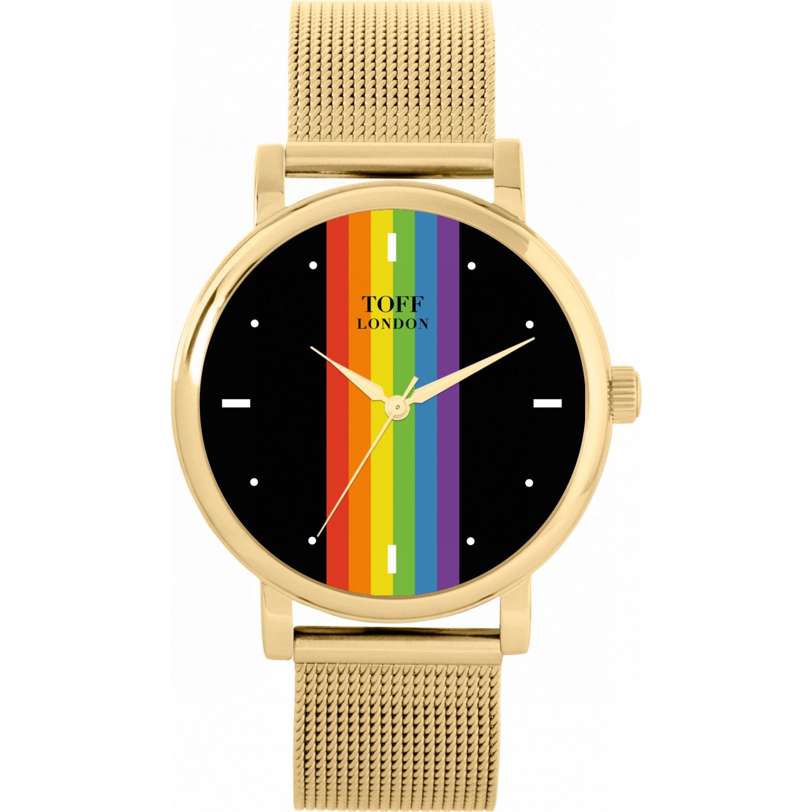 Stylish gold watch from Toff London, featuring a vibrant Pride rainbow design on the dial. The watch has a 38mm gold case and a mesh gold bracelet for a modern and bold look. Perfect for making a statement.