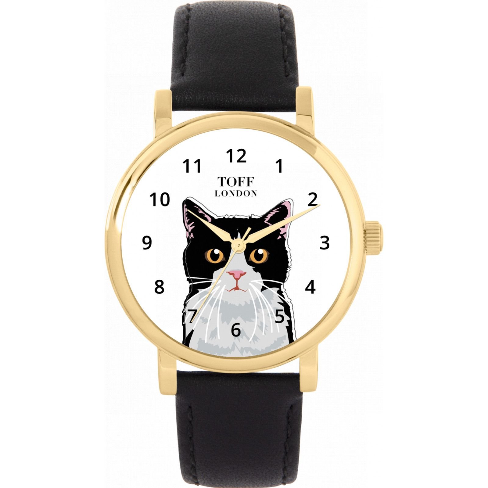 Unique Toff London watch featuring a charming cat design on the dial. The watch has a gold-tone case and a black leather strap. Hand-assembled with durable interchangeable straps.