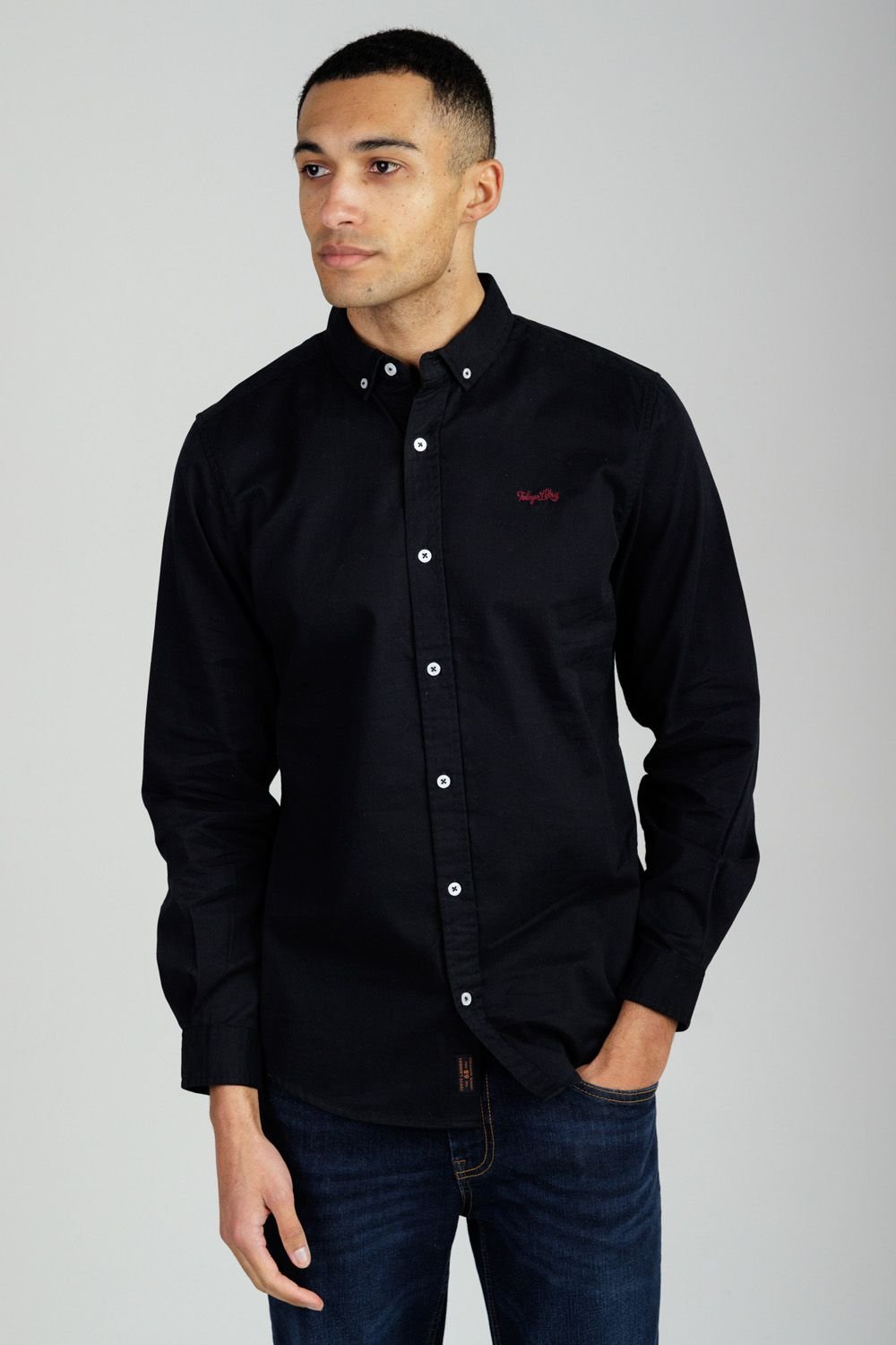 Stylish black cotton Oxford long sleeve shirt from Tokyo Laundry. Features a button-down collar, button cuffs, and an embroidered logo. Perfect for both casual and formal occasions.