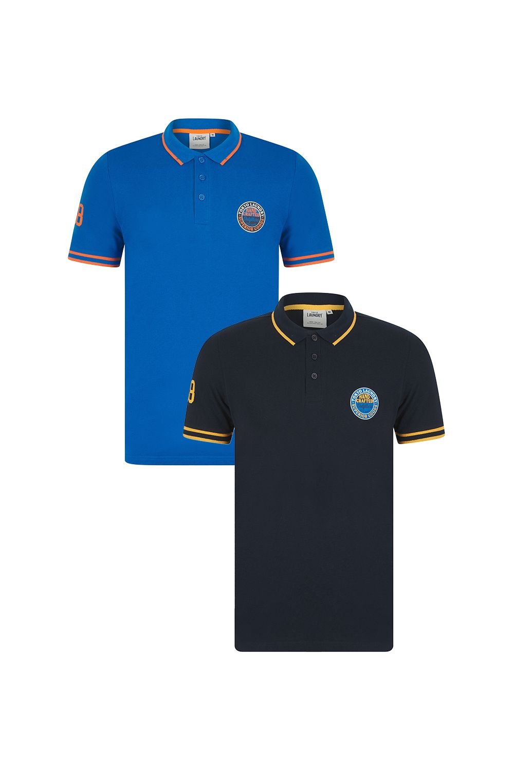 Stylish blue polo shirts from Tokyo Laundry, crafted from a cotton pique blend for comfort and breathability. Featuring a rubber badge on the chest, tipping under the collar, and a unique sleeve print, these shirts combine modern design with quality for a versatile, casual look. Perfect for everyday wear.