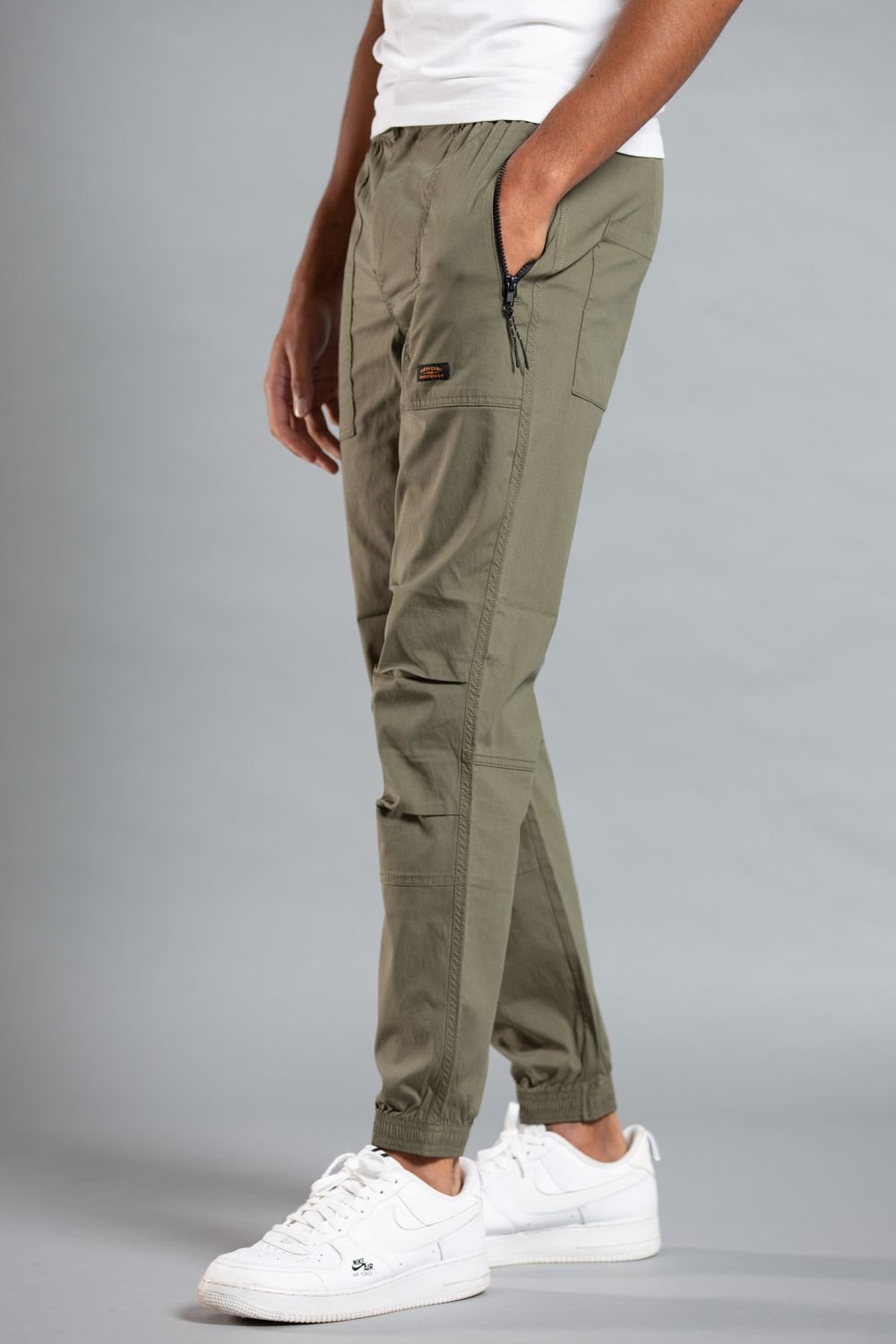 Stylish cargo trousers in khaki cotton from Tokyo Laundry. Featuring multiple side pockets, a D-ring and cargo-style loop, a drawstring with toggles, and an elasticated waistband and cuffs. Ideal for everyday wear.