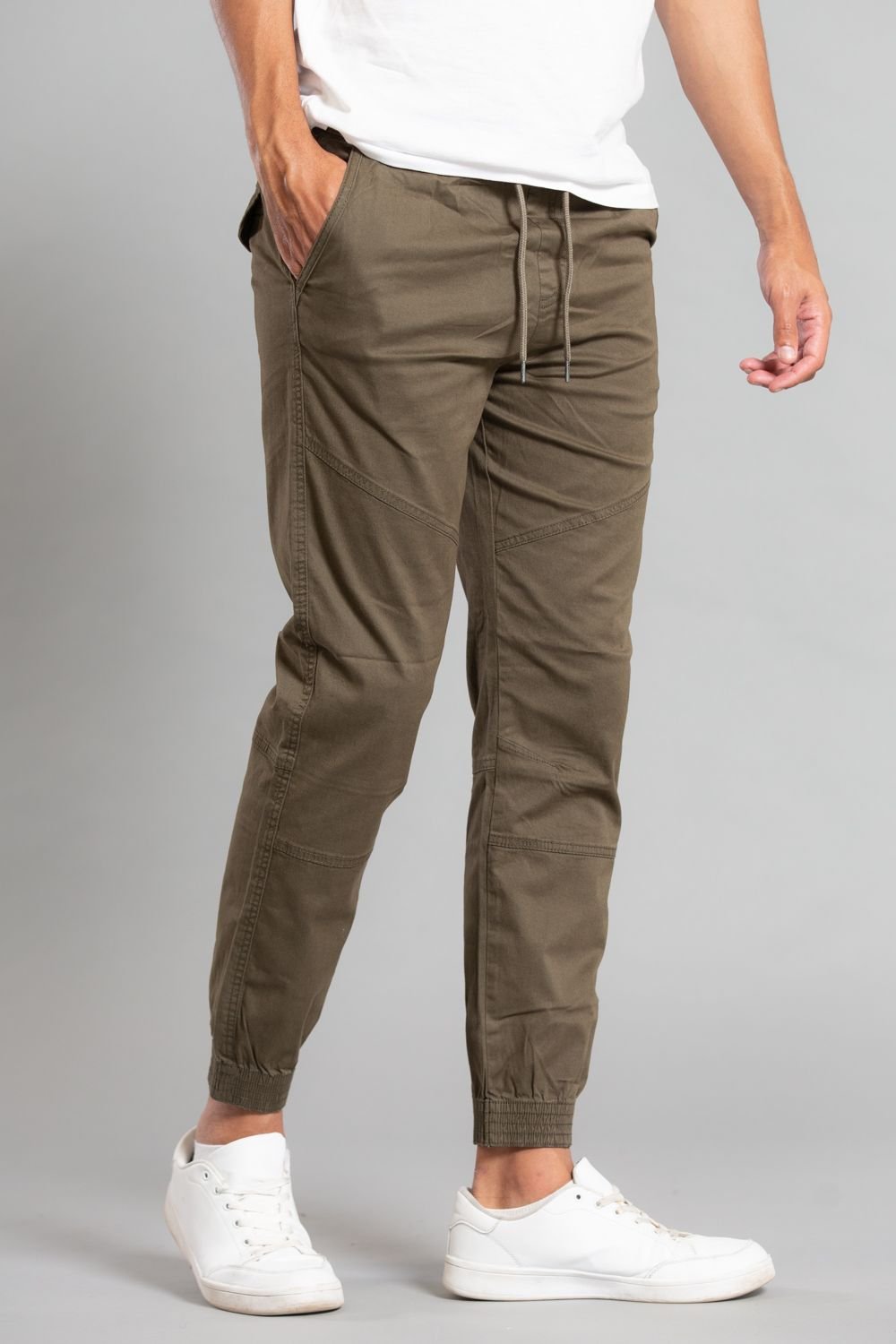 Stylish khaki cotton cuffed trousers from Tokyo Laundry. Features a ribbed elasticated waistband and cuffs, two side pockets with an inside pocket, two back pockets with buttons, and a drawstring. Made from cotton fabric for comfortable wear.