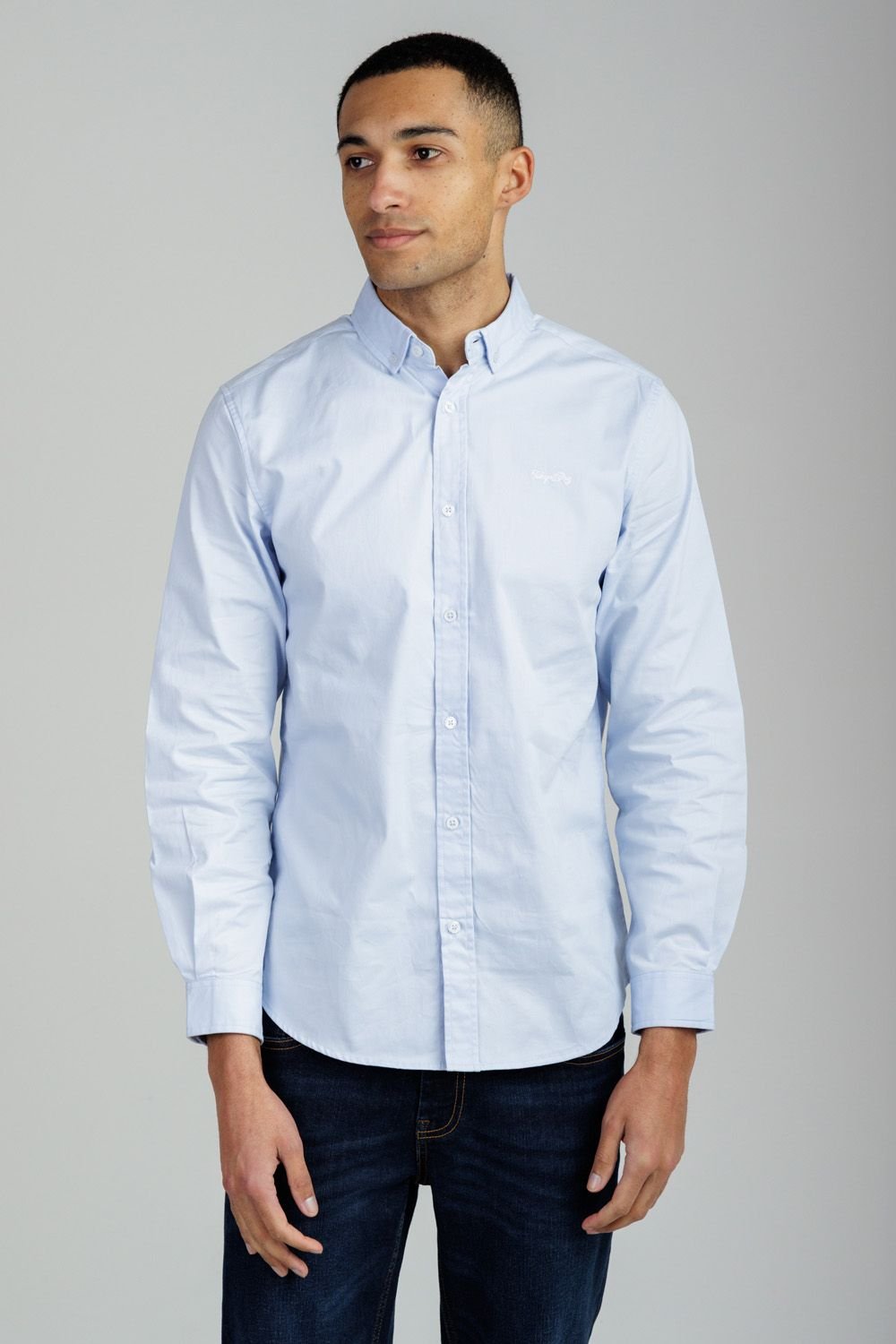 Stylish light blue cotton Oxford long-sleeve shirt from Tokyo Laundry. Features a button-down collar, button cuffs, and an embroidered logo. Perfect for casual and smart-casual looks.