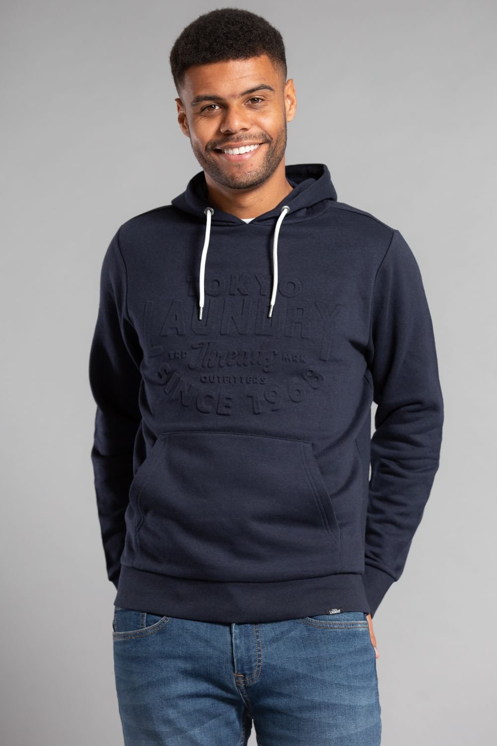 Stylish and comfortable Tokyo Laundry navy hoody made from a soft cotton blend. Features a brush-back fleece interior, kangaroo pocket, drawstring hood, and ribbed cuffs. Ideal for casual wear.