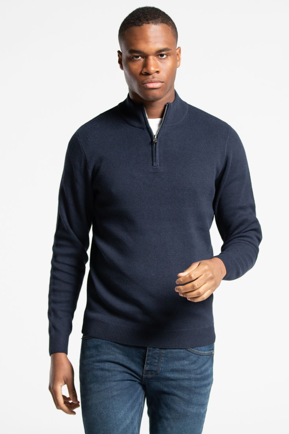 Stylish Navy jumper from Tokyo Laundry made from a cotton blend fabric. Features a quarter zip and ribbed details for a comfortable fit. Ideal for casual and smart-casual occasions.