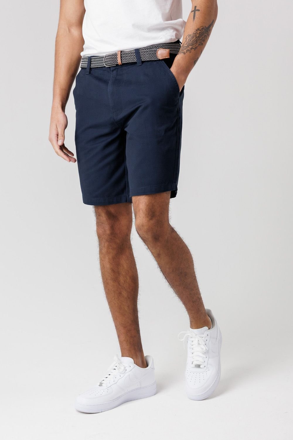 Casual navy shorts crafted from cotton twill fabric. Features a belt and belt loops, side pockets, and a soft-touch finish. Ideal for warm-weather wear and relaxed days.