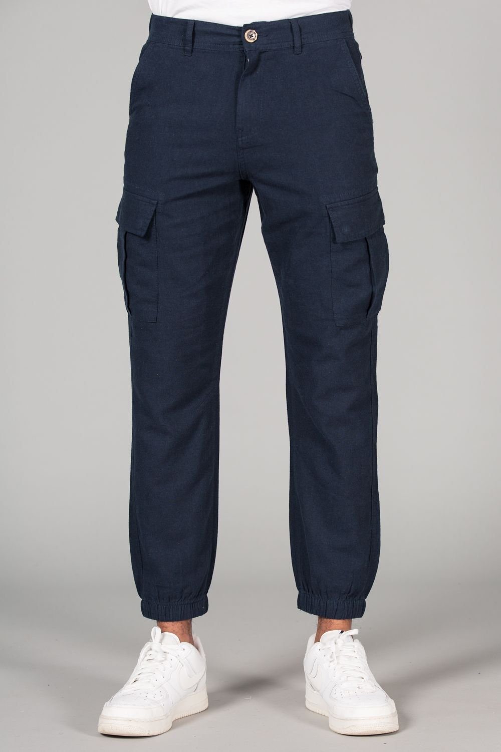 Upgrade your wardrobe with these cargo-style trousers from Tokyo Laundry. Made from a breathable linen and cotton blend, these trousers feature belt loops, elasticated cuffs, and cargo-style pockets for extra style. Perfect for both casual and formal occasions.