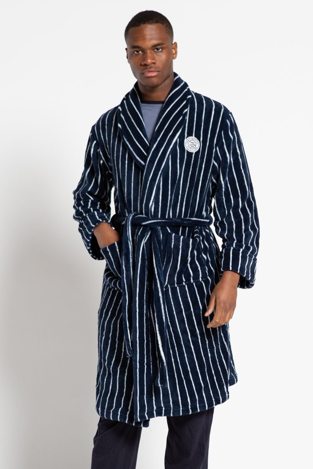 This navy striped fleece dressing gown from Tokyo Laundry is a cosy classic. Features a shawl collar, two front pockets, and a belted tie fastening. Perfect for night-time essentials.