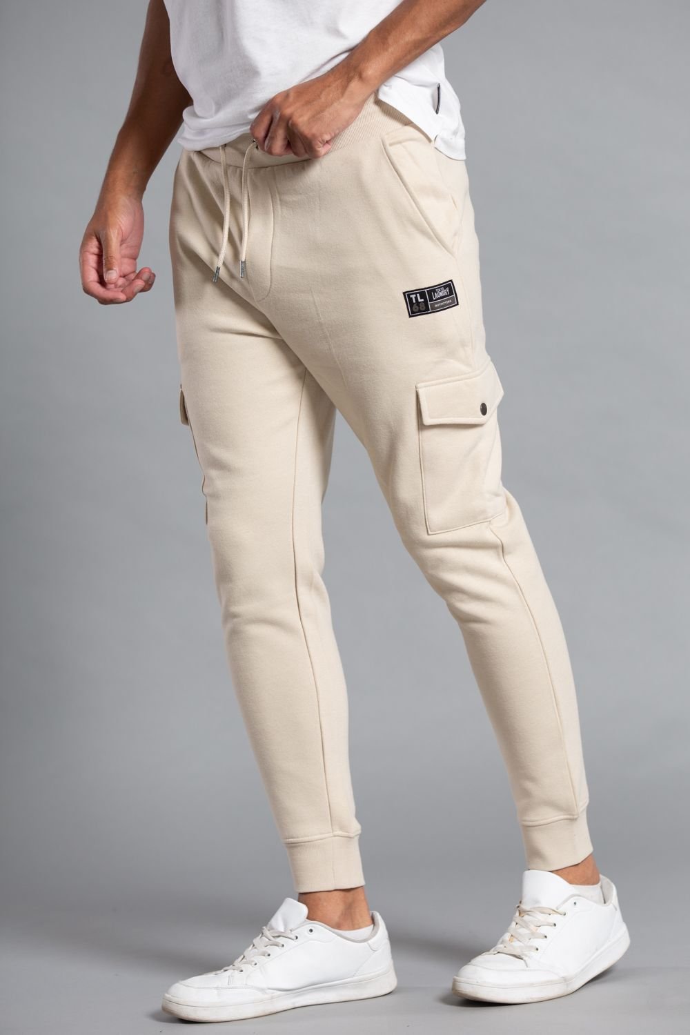 Comfortable men's joggers from Tokyo Laundry in stone colour. Made from a soft cotton blend fabric, these joggers feature a stylish woven badge, drawstring with toggle, and cargo-style pockets. Perfect for lounging or casual outings.