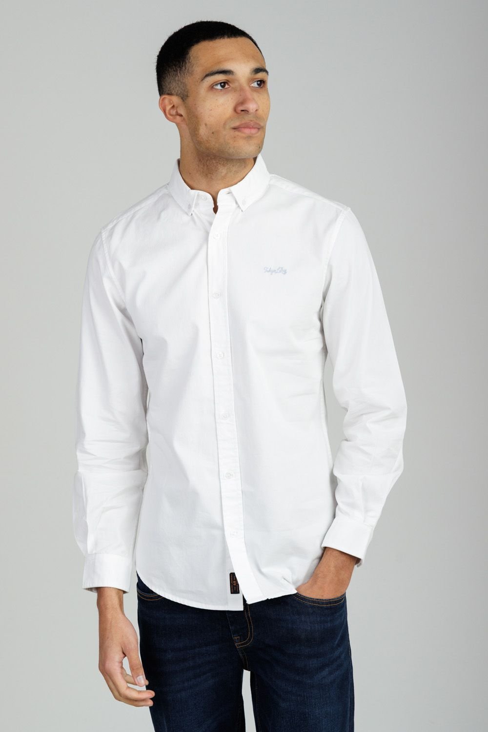 Stylish long-sleeve shirt in pure white from Tokyo Laundry. Features a button-down collar, button cuffs, and an embroidered logo. Made from soft cotton for comfort and durability. Ideal for both casual and formal occasions.
