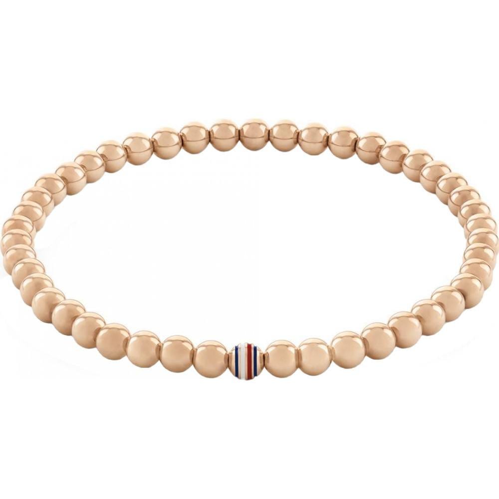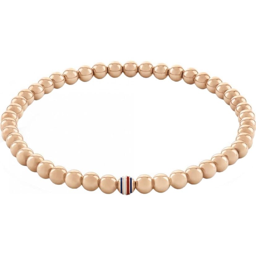 This Tommy Hilfiger bracelet features a beaded design in rose gold. The bracelet is crafted with a series of small, polished beads that create a delicate and elegant look. A small, colorful stripe detail adds a pop of color and a touch of modern flair.