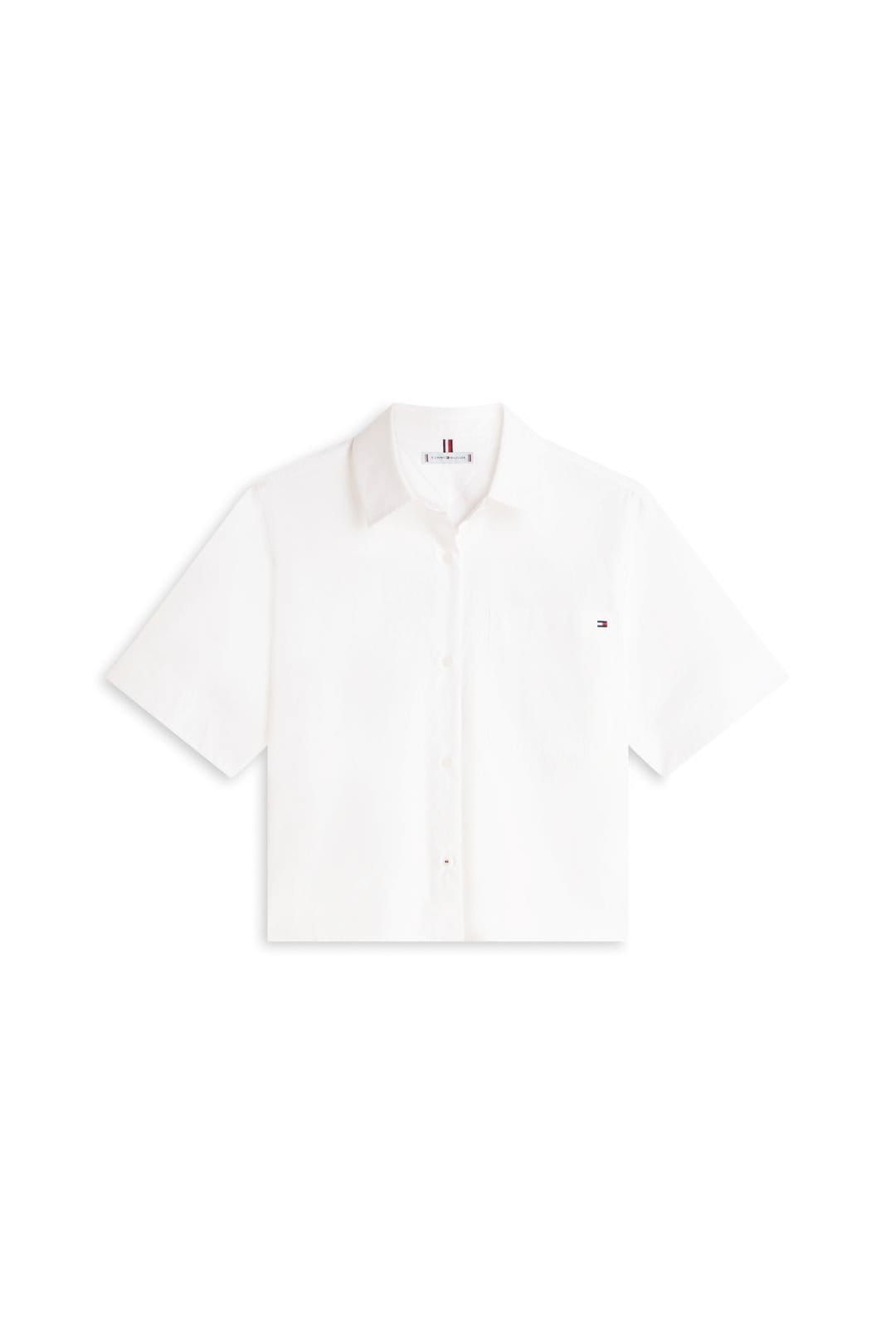 This Tommy Hilfiger shirt features a cropped design with a relaxed boxy silhouette for a contemporary look. The classic collar and button-through front add a timeless touch. Perfect for warmer weather, the short sleeves allow for easy layering. The subtle Tommy Hilfiger branding on the chest completes the look.