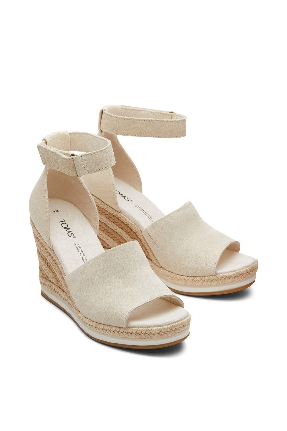 Versatile TOMS Marisol wedge sandals in beige with a closed heel and adjustable ankle strap. Crafted from canvas and jute with a comfortable OrthoLite X40 sole. Ideal for casual summer wear.