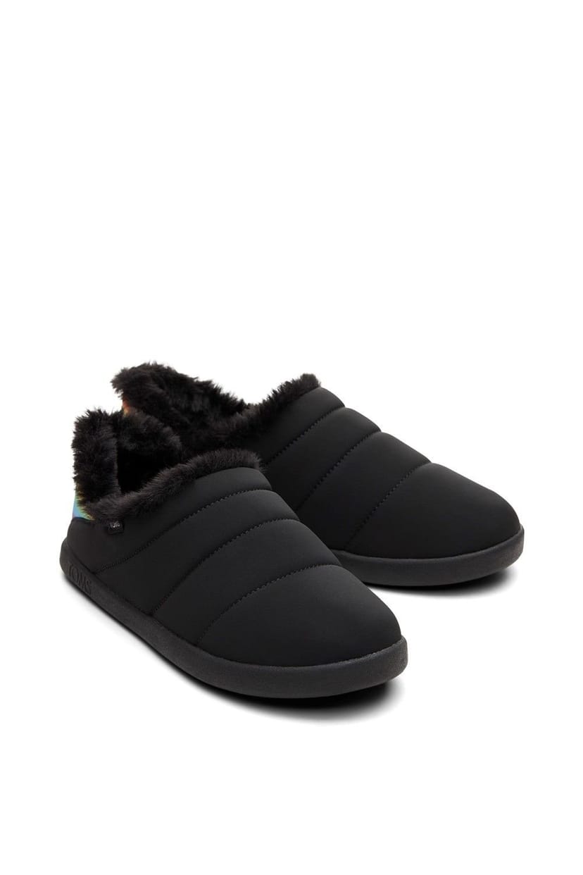 Pride-inspired TOMS Ezra Classic Slippers in black with a cozy, quilted exterior and fur-lined collar. Perfect for relaxed indoor wear.