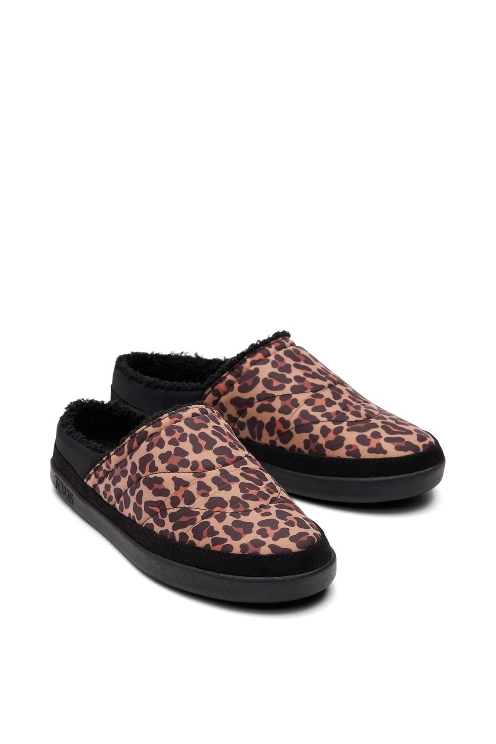 Cozy leopard print mule slippers with a faux fur lining. Featuring textile uppers and a TPR outsole with a custom TOMS tread. Perfect for lounging at home.