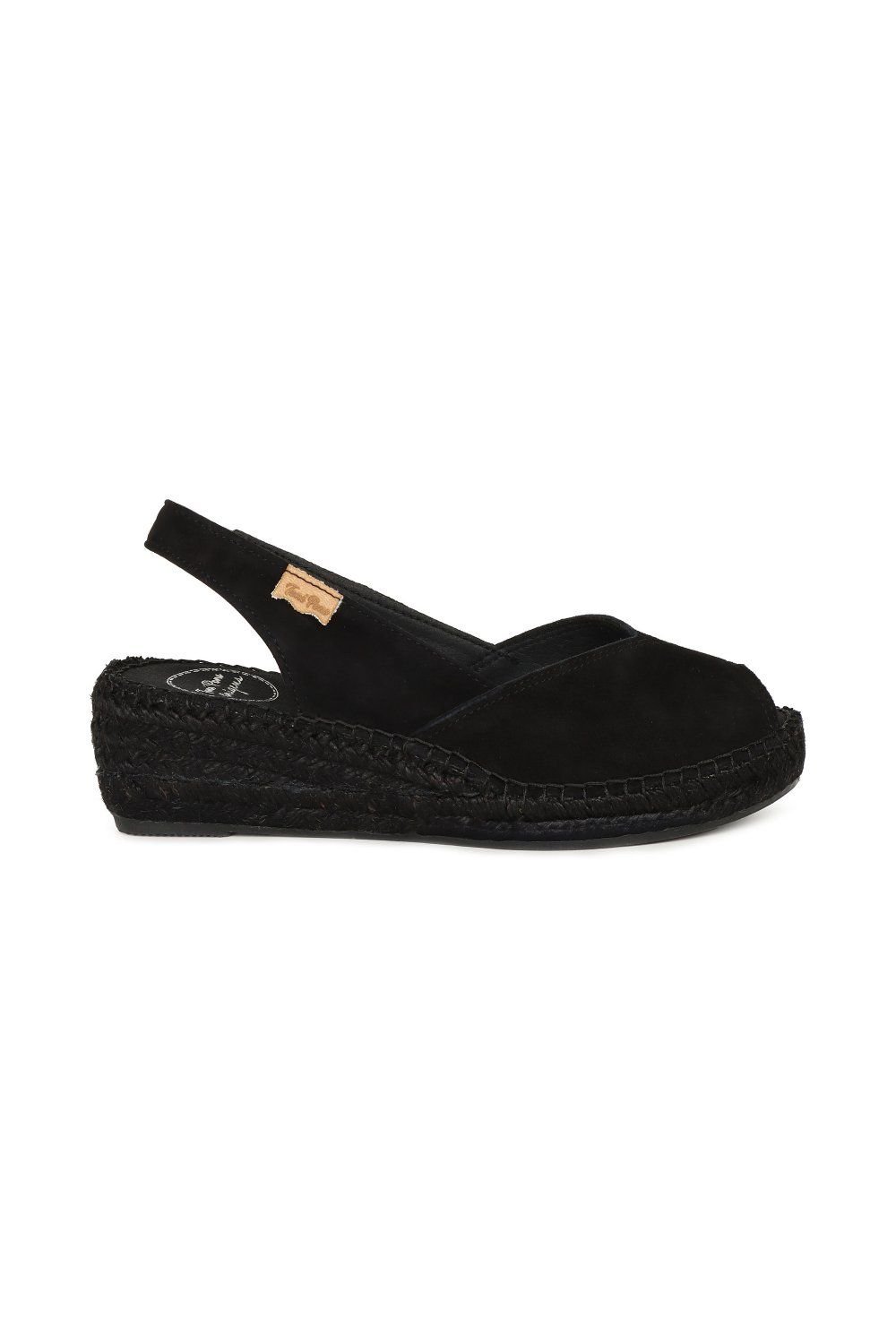 Stylish black suede wedge heel espadrilles sandals by Toni Pons. Featuring a smooth leather upper and a woven jute sole, these sandals offer a fresh and comfortable feel for summer wear.