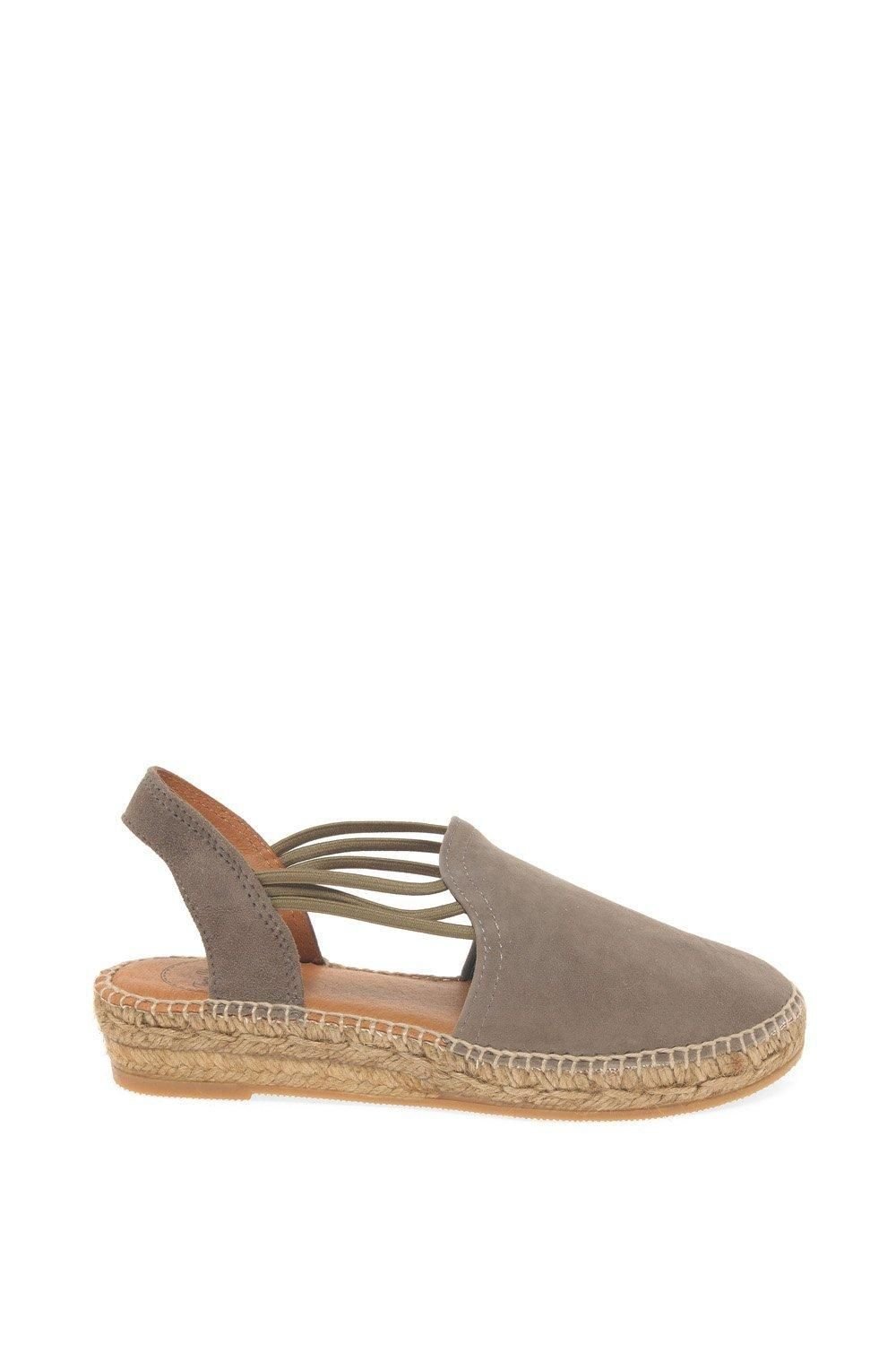 Charming taupe suede espadrilles by Toni Pons. The slip-on design and elasticated components ensure a secure fit. Ideal for a Mediterranean aesthetic.