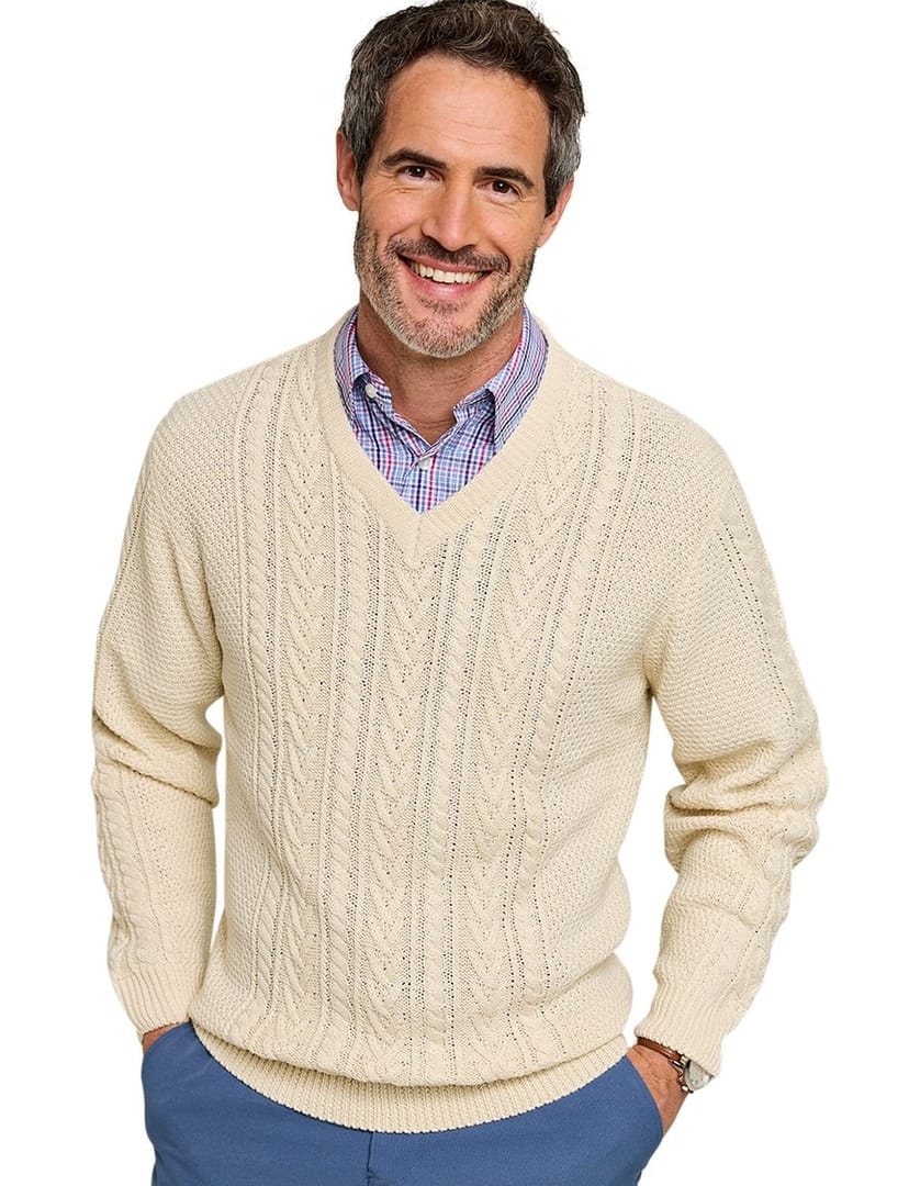 Timeless V-neck jumper with a classic cable knit design. Made from a soft cotton blend, this jumper offers warmth and breathability. Ideal for casual and smart-casual occasions.